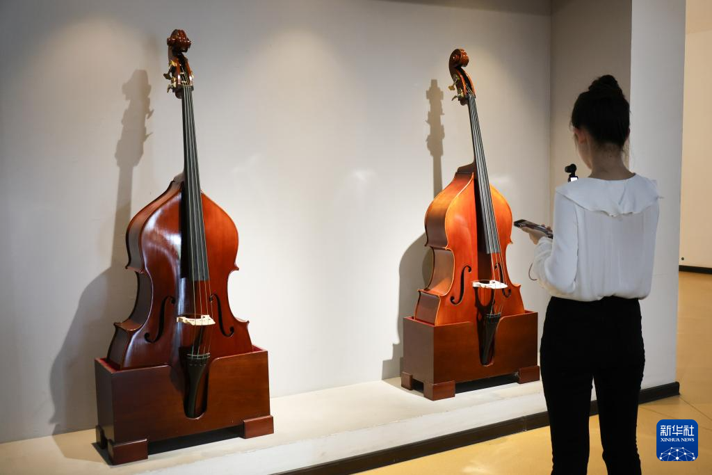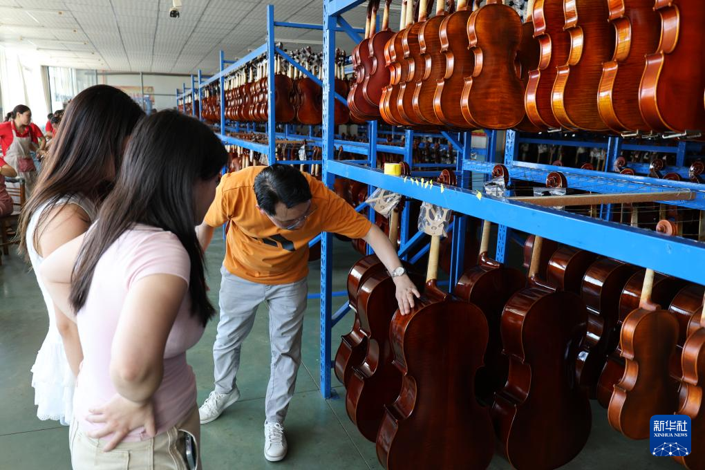 7月24日,在河南省驻马店市确山县的确山提琴产业园,游客在一家企业的展馆内参观。