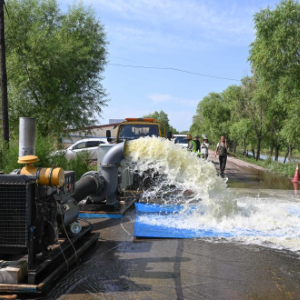 8月1日在内蒙古呼和浩特市土默特左旗一处村庄外,抽水机在排水。