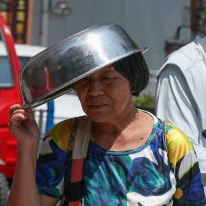 8月2日,重庆市江北区,市民在烈日下用盆遮挡阳光。