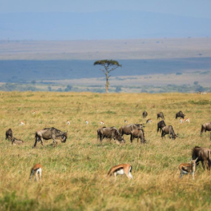 7月30日,在肯尼亚马赛马拉国家保护区,角马和羚羊在草原上活动。