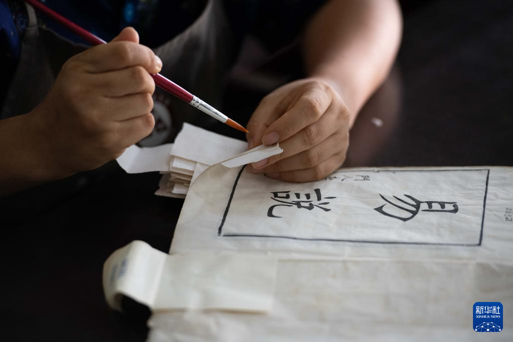 6月17日,在安徽省图书馆内,古籍修复师耿宁在修补书叶。