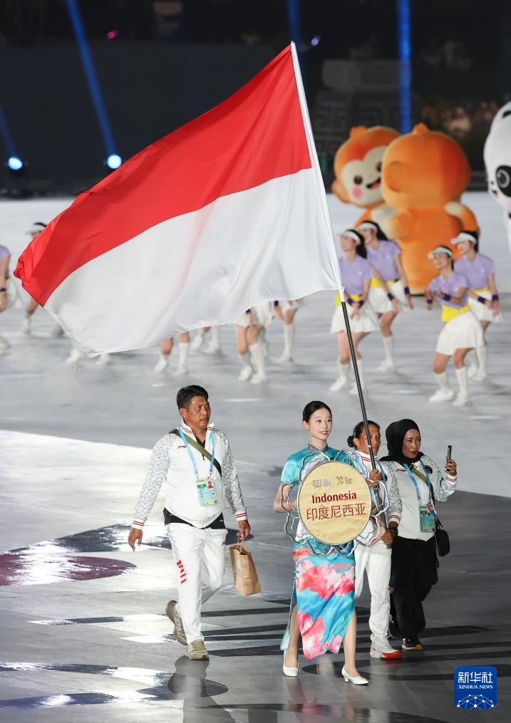 8月7日,印度尼西亚体育代表团在开幕式上入场。