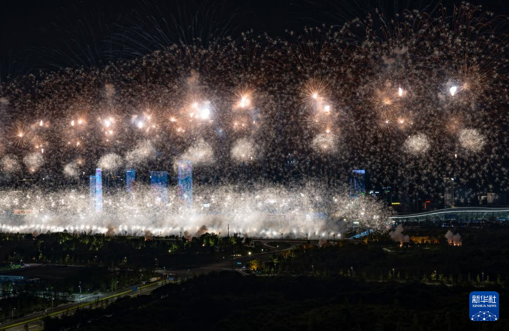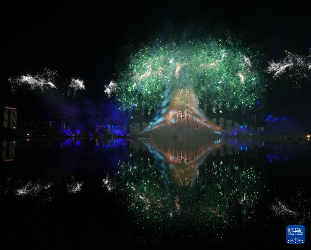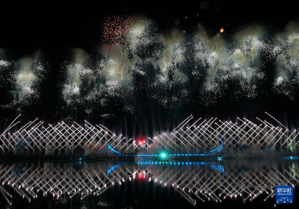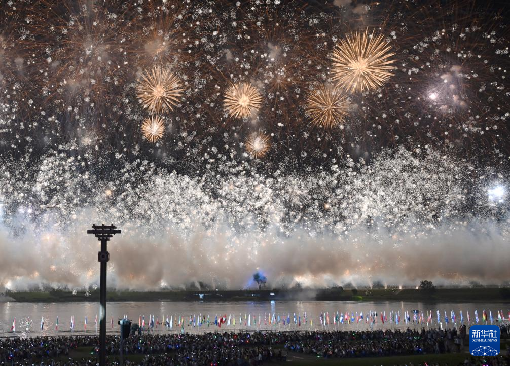这是8月7日拍摄的开幕式上的焰火表演。
