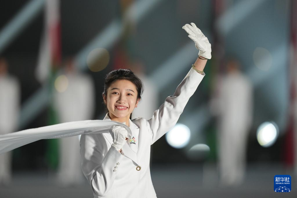 8月7日,成都世运会组委会会旗执旗手黄张嘉洋在开幕式上。