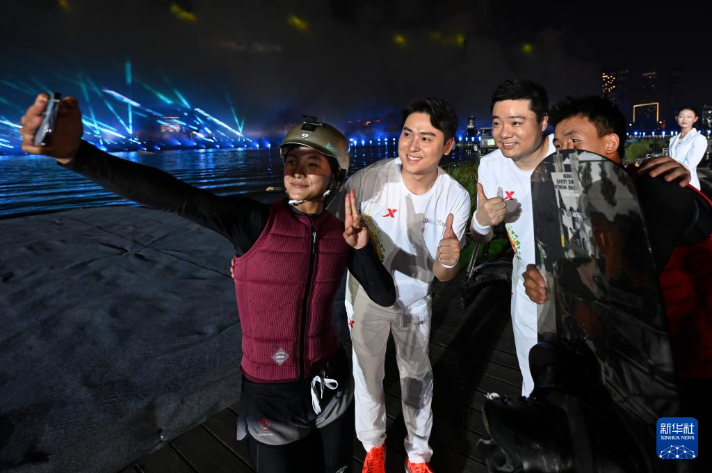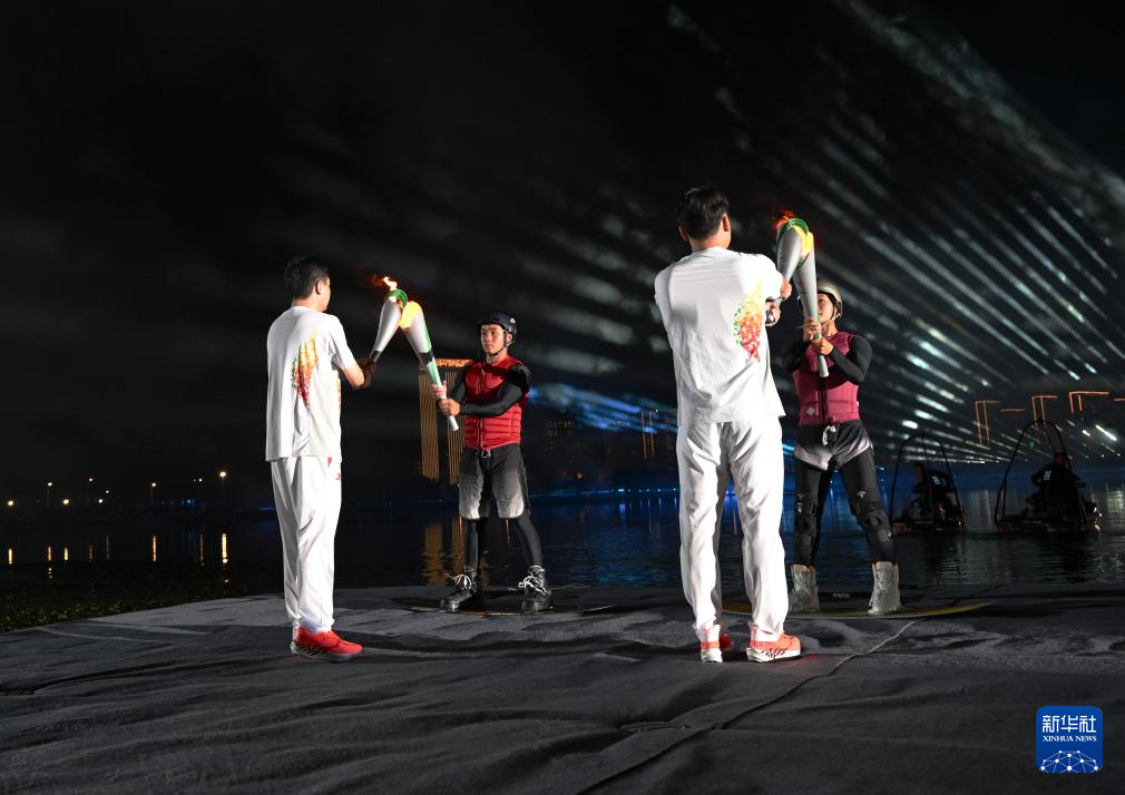 8月7日,火炬手董栋(右二)、丁俊晖(右一)与徐露(左一)、阿卢晓波在开幕式上进行火炬交接。