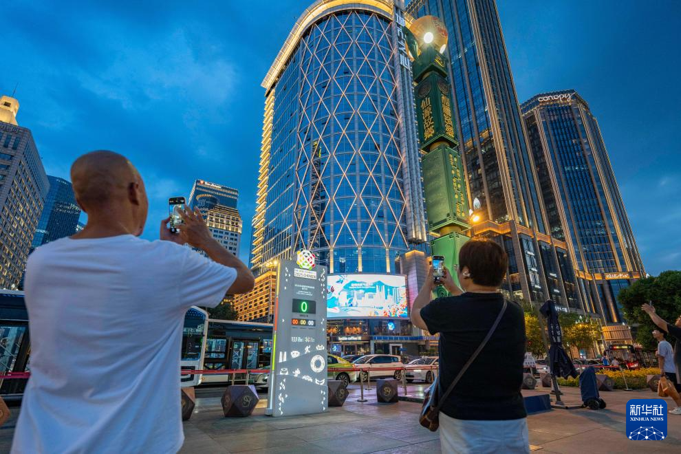 8月7日,人们在成都太古里拍摄第12届世界运动会倒计时牌。