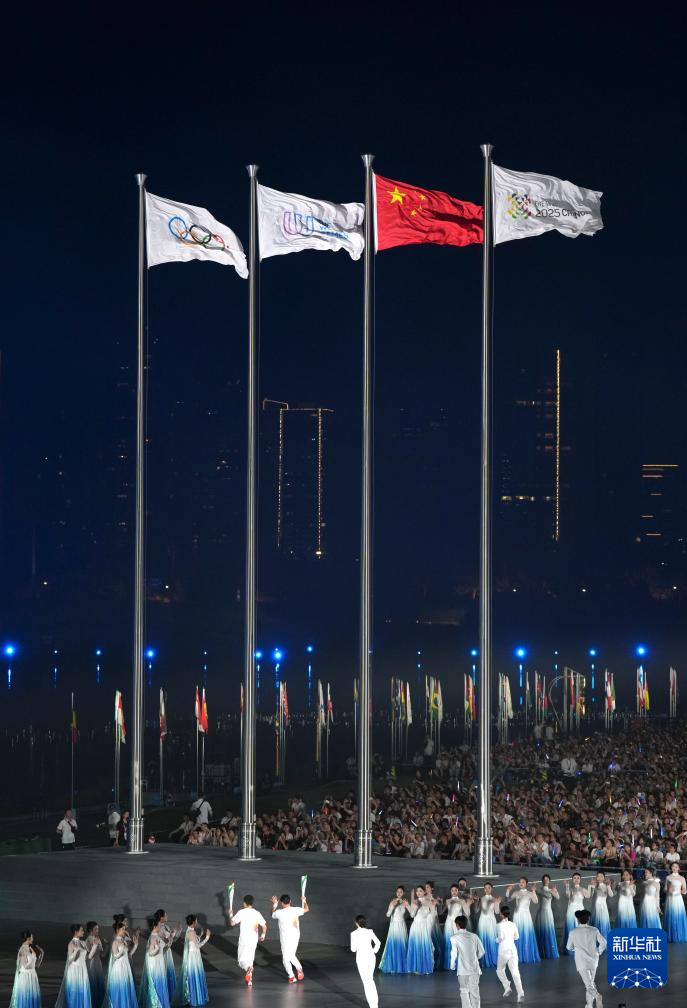 8月7日,中华人民共和国国旗(左二)、国际世界运动会协会会旗(右二)、国际奥林匹克委员会会旗(右一)、成都世运会组委会会旗在开幕式上升起。