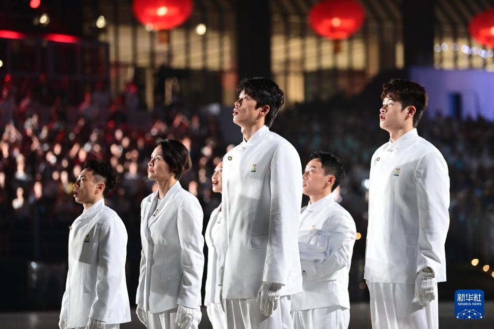 8月7日,成都世运会组委会会旗执旗手在开幕式上唱国歌。