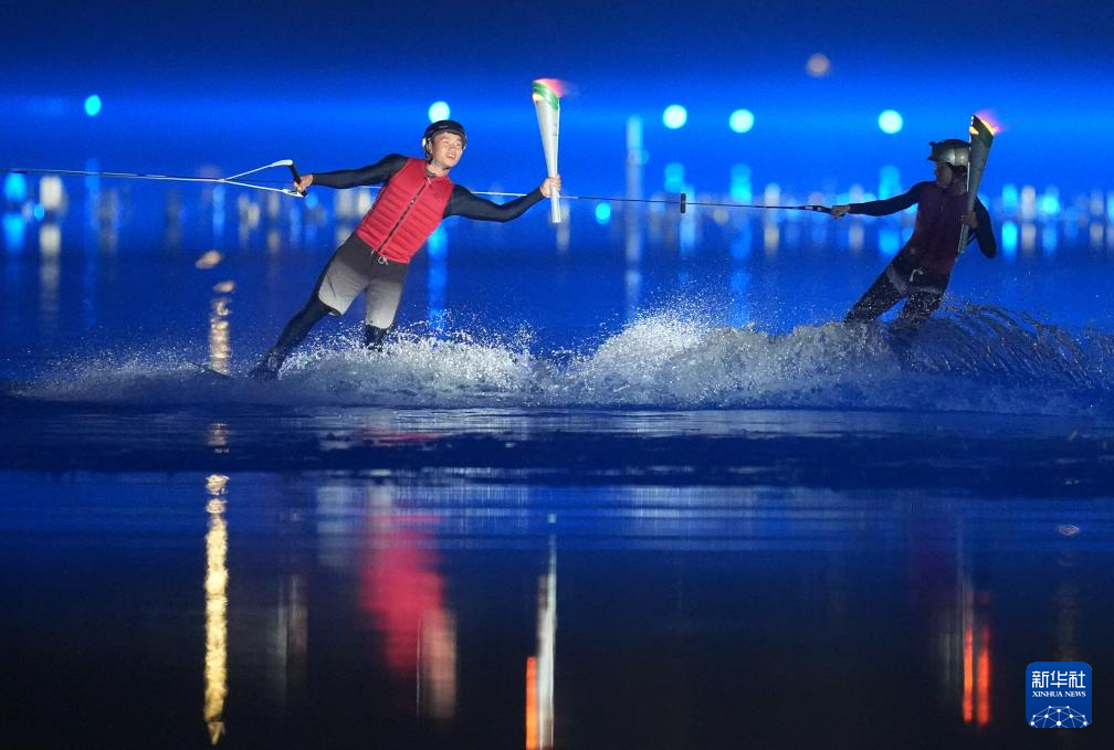 8月7日,火炬手徐露、阿卢晓波(左)在点火环节中。