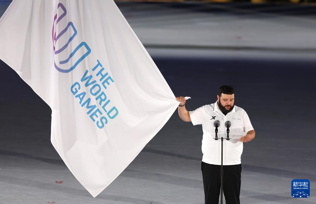 8月7日,国际世界运动会协会会旗执旗手在开幕式上唱国歌。