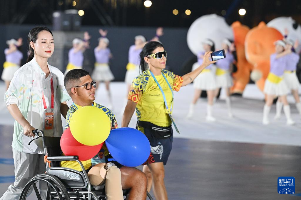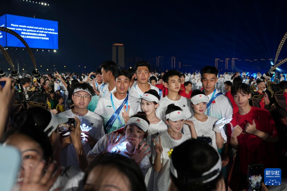 8月7日,代表团成员在开幕式上与志愿者自拍合影。
