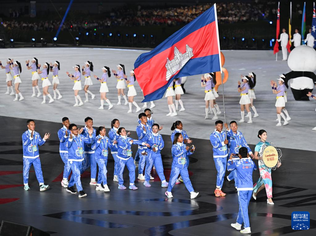 8月7日,柬埔寨体育代表团在开幕式上入场。