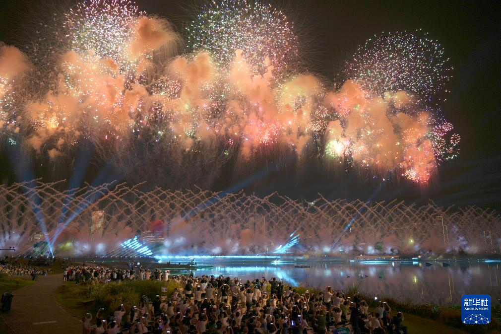 8月7日,观众在开幕式上拍摄焰火表演。