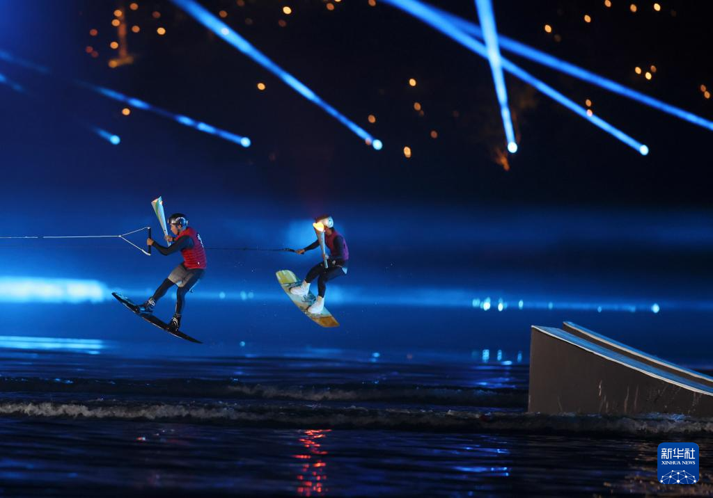 8月7日,火炬手丁俊晖、董栋在开幕式上传递火炬。