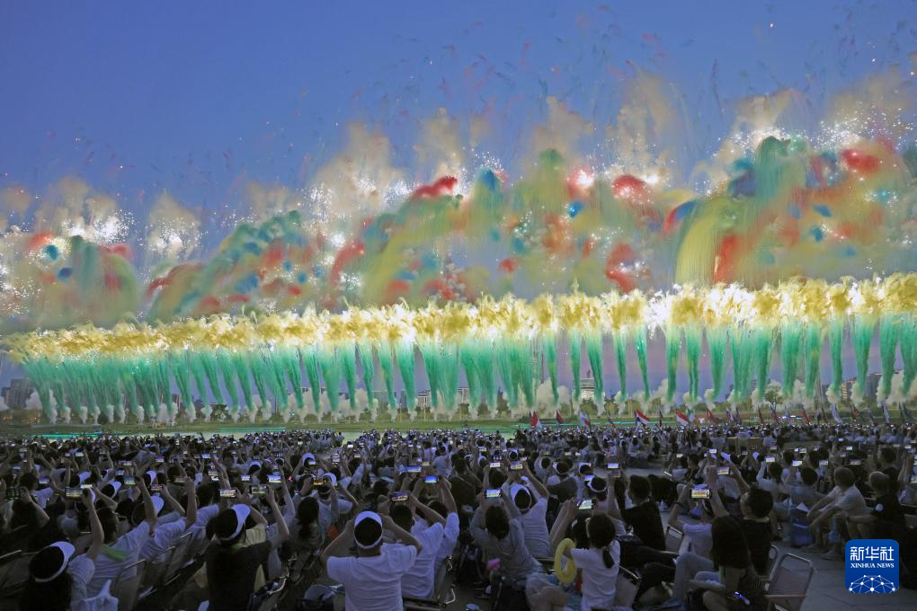 8月7日,观众在开幕式上用手机拍摄焰火表演。