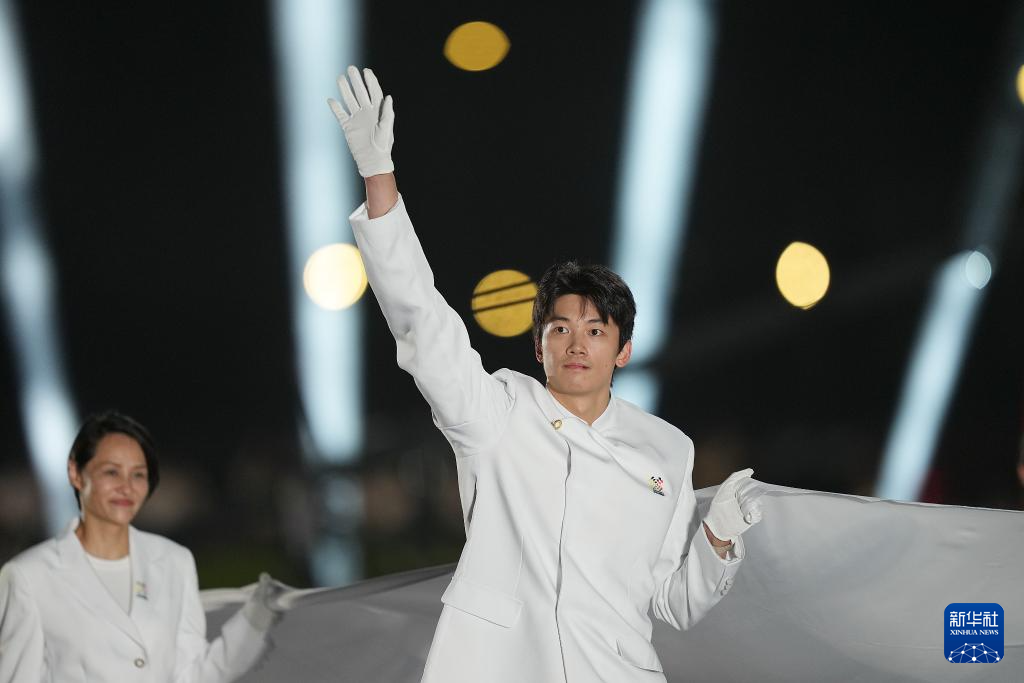 8月7日,国际奥林匹克委员会会旗执旗手潘展乐在开幕式上。