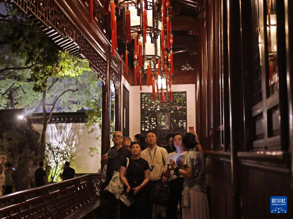 8月8日晚,游客在讲解员的带领下夜游豫园。