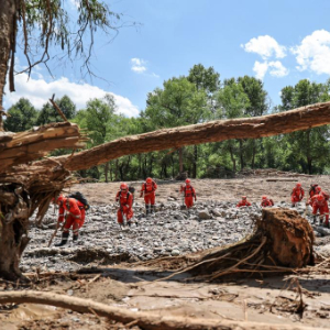 8月11日,武警甘肃总队机动支队官兵在兰州市榆中县马莲滩村搜寻失联人员。