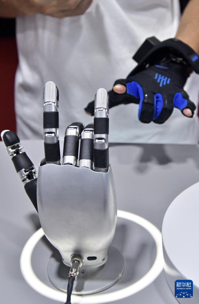 在世界机器人大会展馆内,一款人形机器人灵巧手产品进行功能展示(8月11日摄)。