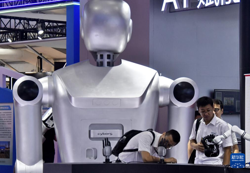 在世界机器人大会展馆内,观众在参观展出的一款人形机器人智慧工厂自动化检测系统(8月11日摄)。
