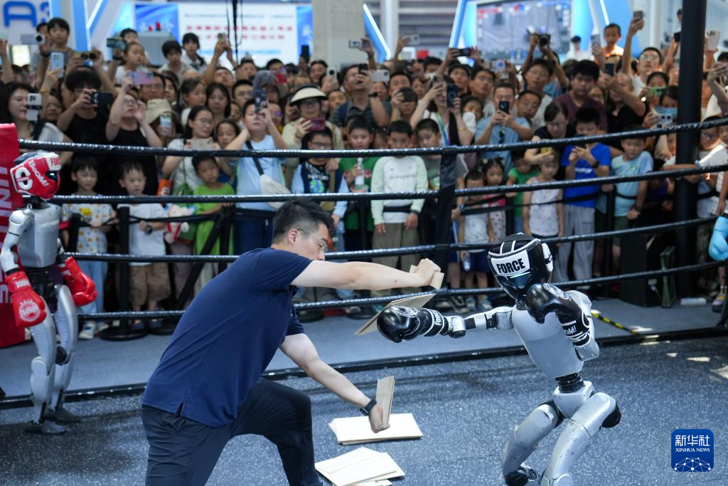 在世界机器人大会展馆内,观众在宇树机器人展台观看机器人拳击展示(8月11日摄)。