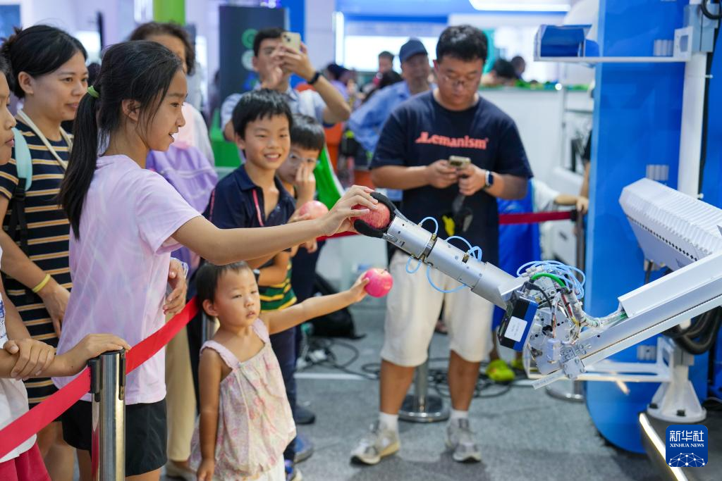 在世界机器人大会展馆内,几名小朋友在参观展出的果园多臂采摘机器人(8月11日摄)。