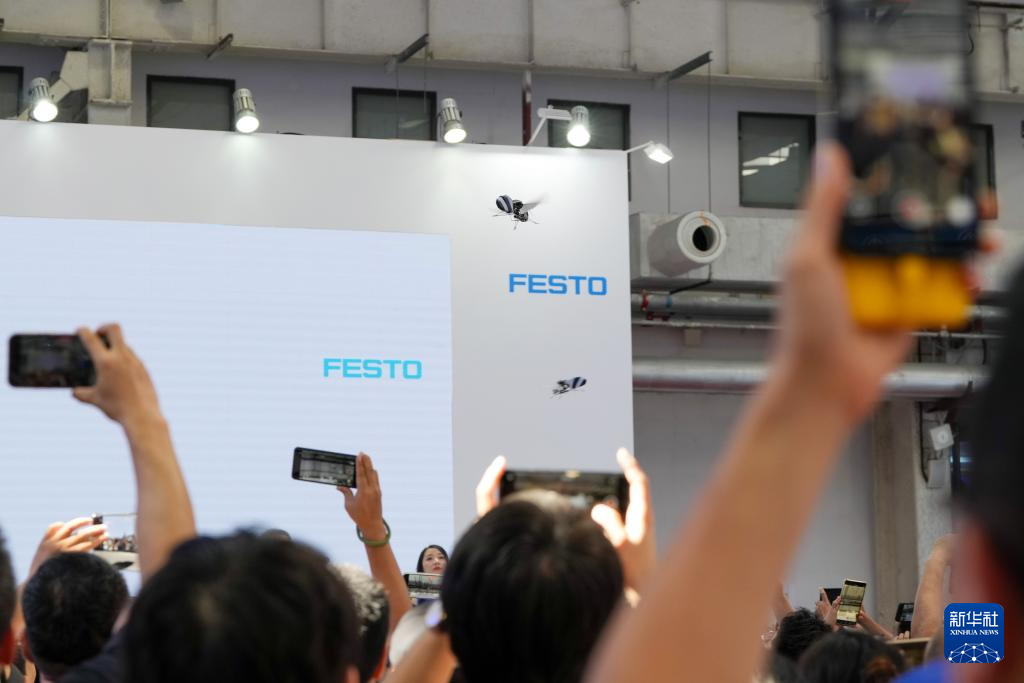 在世界机器人大会展馆内,观众在观看一款仿生机器人飞行展示(8月11日摄)。