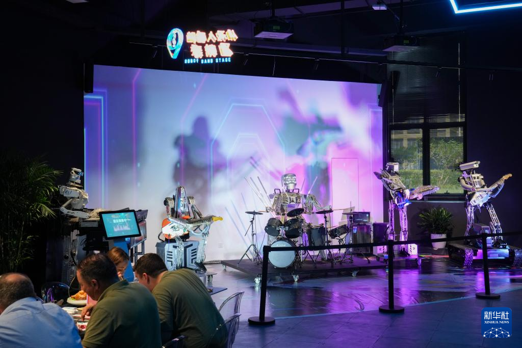 在位于北京经开区的“机器人焰究所”主题餐厅内,机器人乐队在进行表演(8月6日摄)。