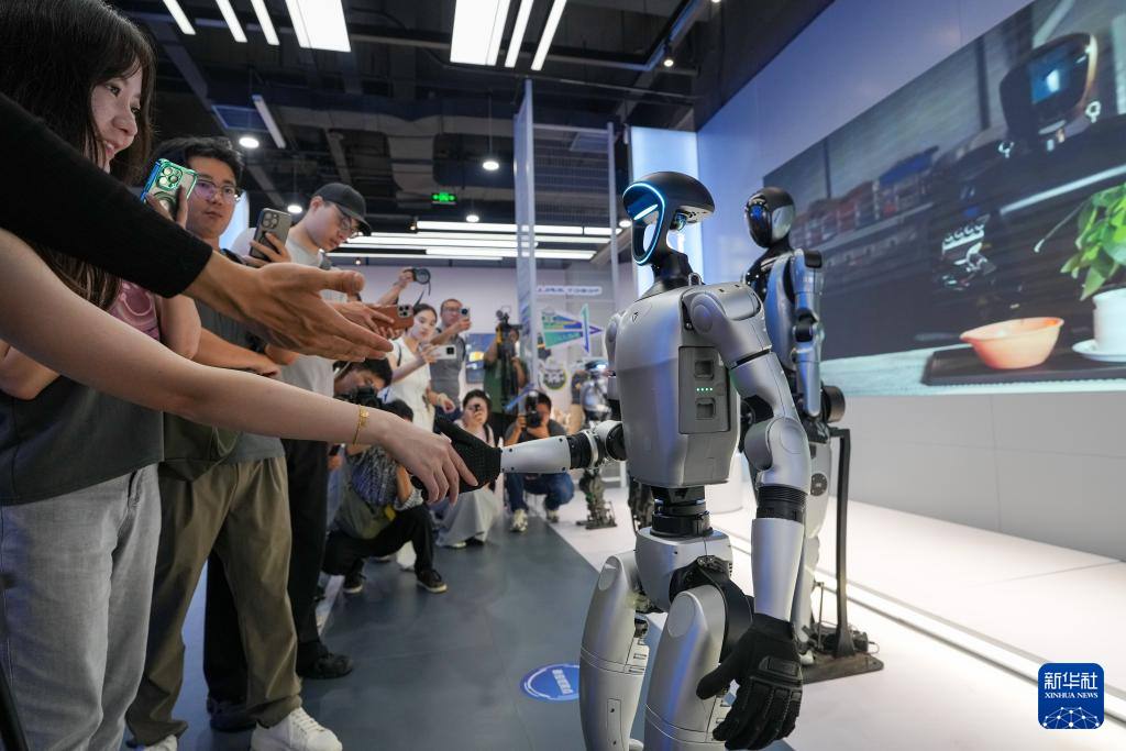 在位于北京经开区机器人大世界的全球首个具身智能机器人4S店(ROBOT MALL)内,观众在观看一款人形机器人的互动展示(8月6日摄)。