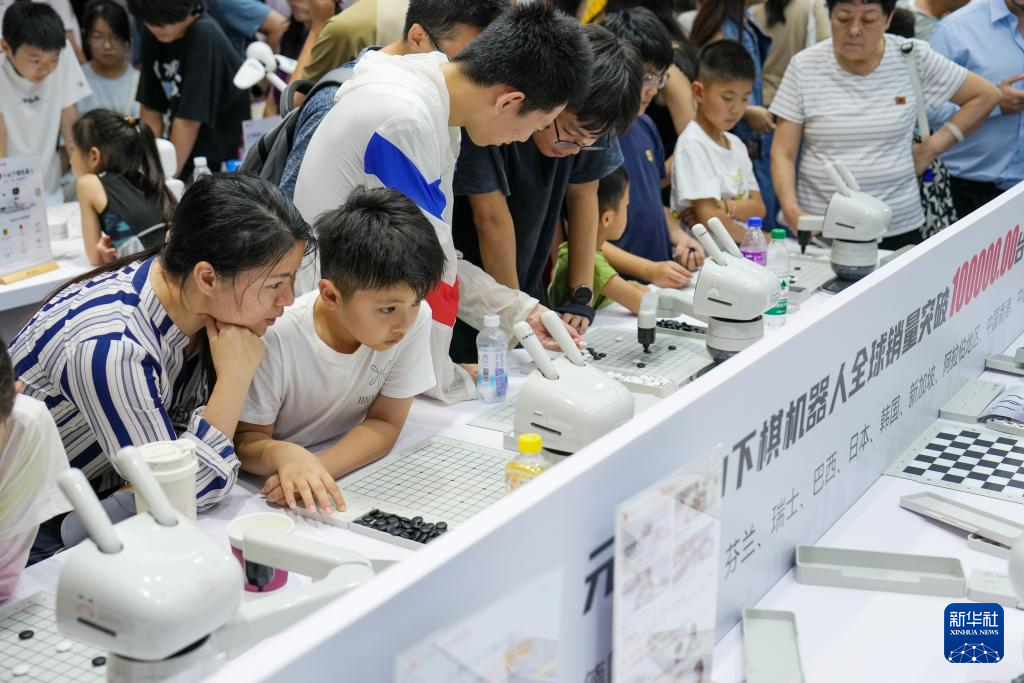 在世界机器人大会展馆内,小朋友在与下棋机器人互动下棋(8月11日摄)。