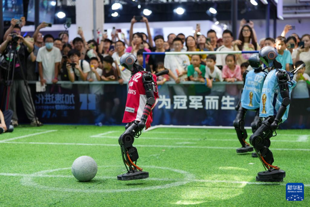 在世界机器人大会展馆内,观众在加速进化公司展台观看人形机器人足球赛演示(8月11日摄)。