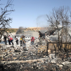 8月14日,在叙利亚伊德利卜,救援人员和居民在爆炸后的废墟中搜救幸存者。