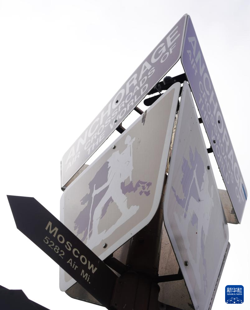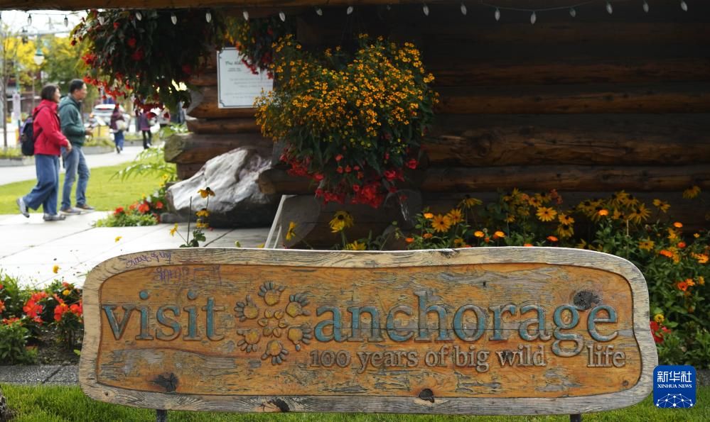 这是8月14日在美国阿拉斯加州安克雷奇的游客中心门外拍摄的标牌。