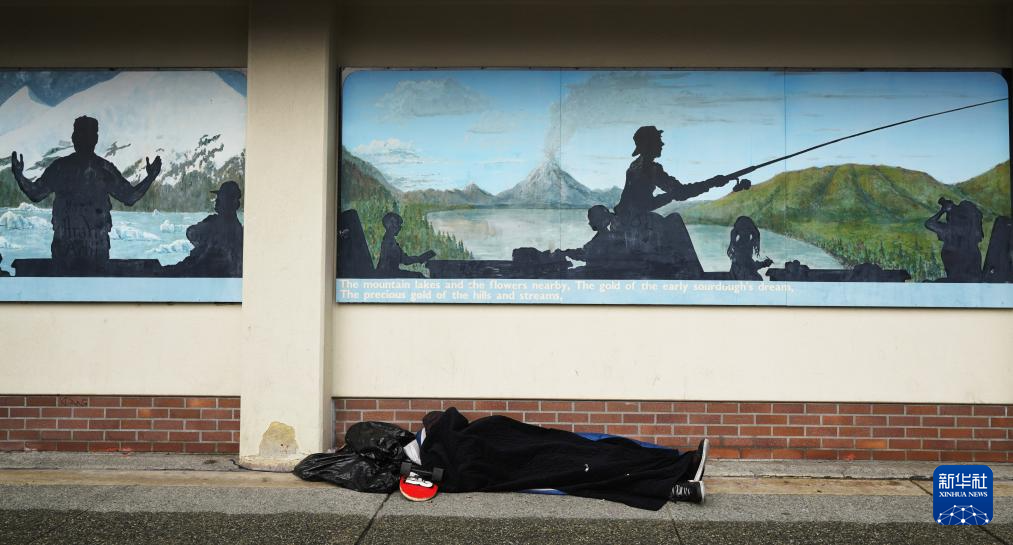 8月14日,在美国阿拉斯加州安克雷奇市中心,一名男子露宿街头。