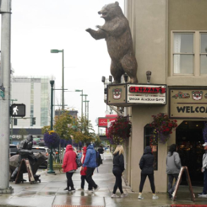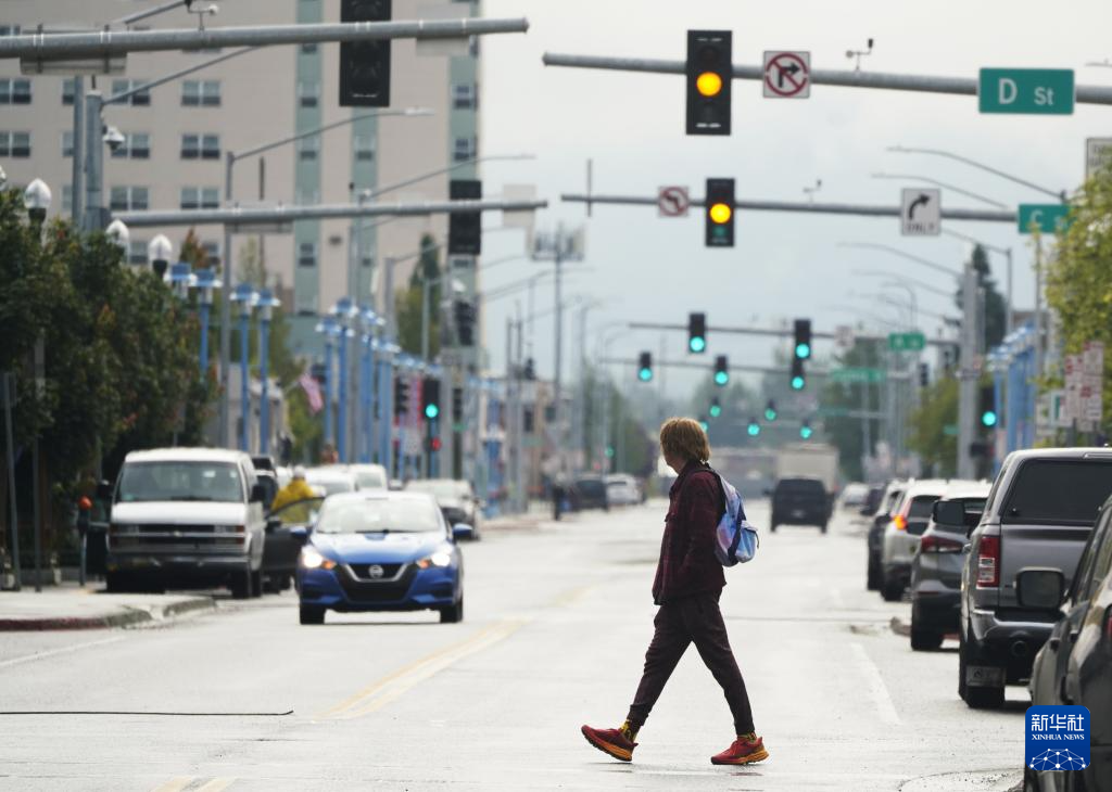 8月14日,行人从美国阿拉斯加州安克雷奇市中心街头走过。