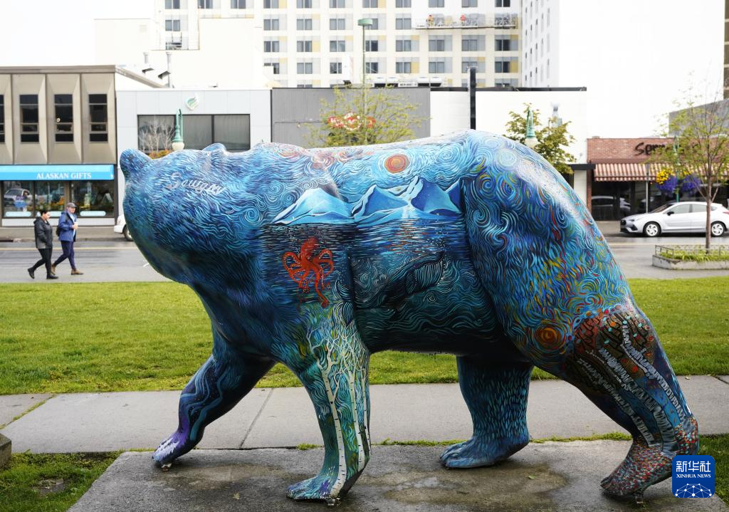 这是8月14日在美国阿拉斯加州安克雷奇市中心拍摄的街头雕塑。