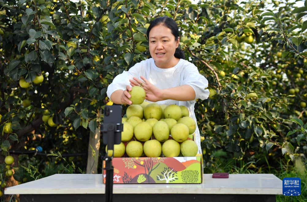 8月14日,工作人员在河北威县龙集梨园内直播推介梨果。