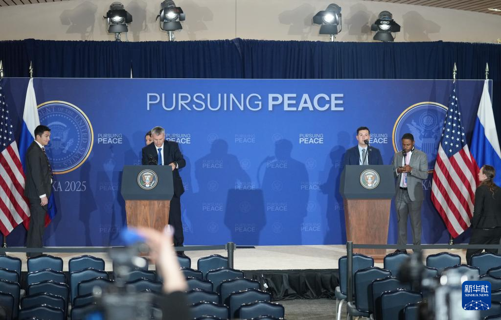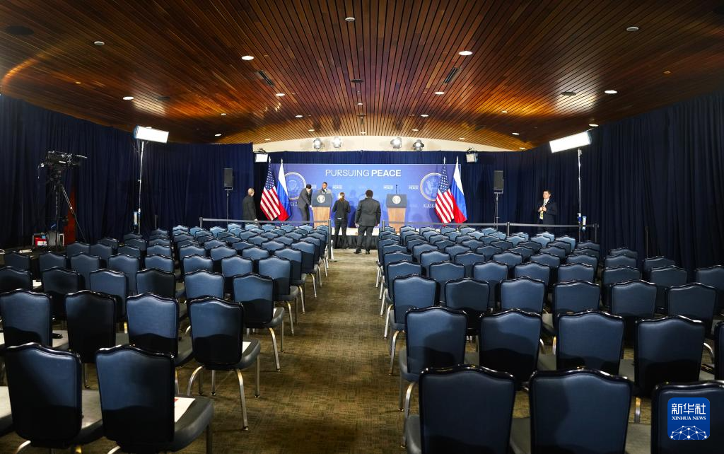 这是8月15日在美国阿拉斯加州安克雷奇市埃尔门多夫-理查森联合军事基地拍摄的新闻发布会会场。