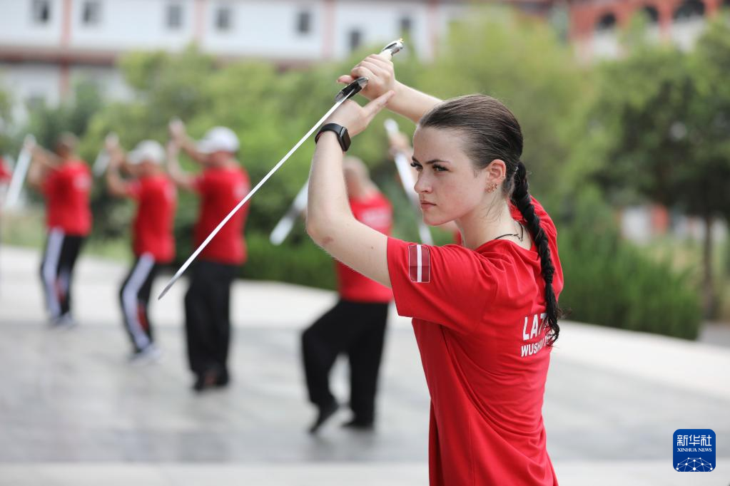 在河南省焦作市温县太极拳文化国际交流中心,拉脱维亚学员在练习太极单剑(8月8日摄)。