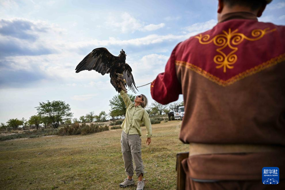 8月16日,在吉尔吉斯斯坦乔尔蓬阿塔附近,一名外国游客体验训练猎鹰。