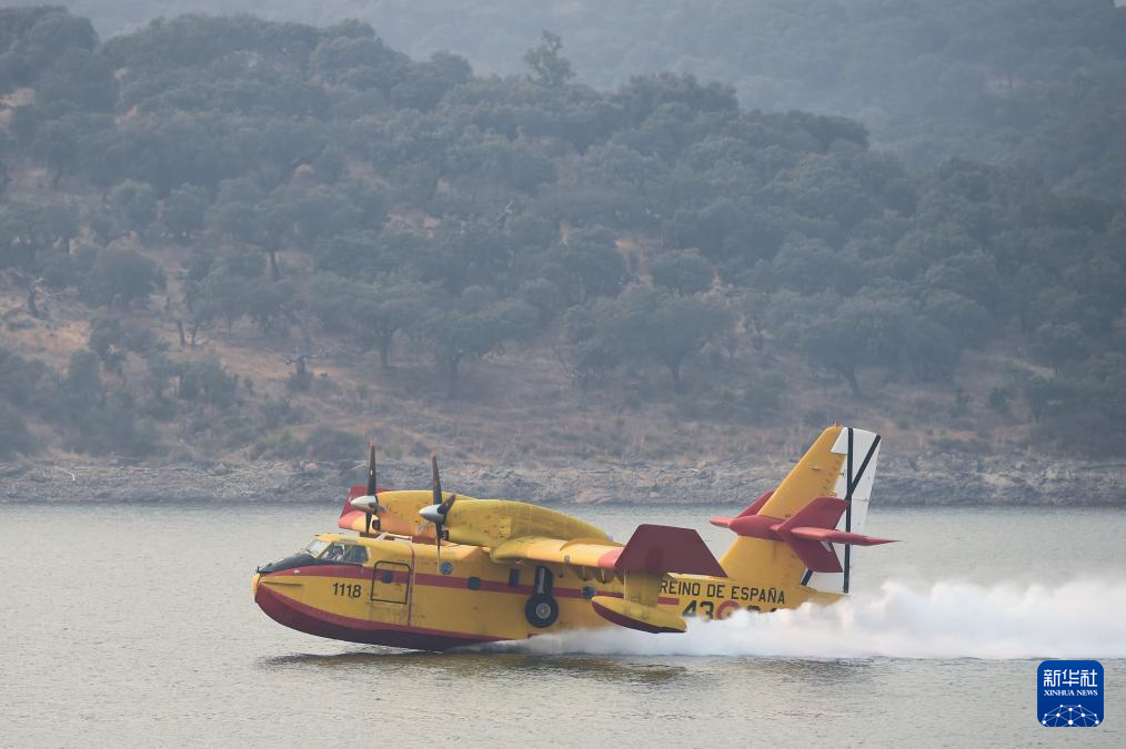 8月18日,在西班牙卡塞雷斯省,参与灭火的飞机正在取水。