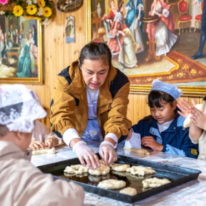 8月21日,在内蒙古恩和俄罗斯族民族乡,小朋友在体验制作列巴。