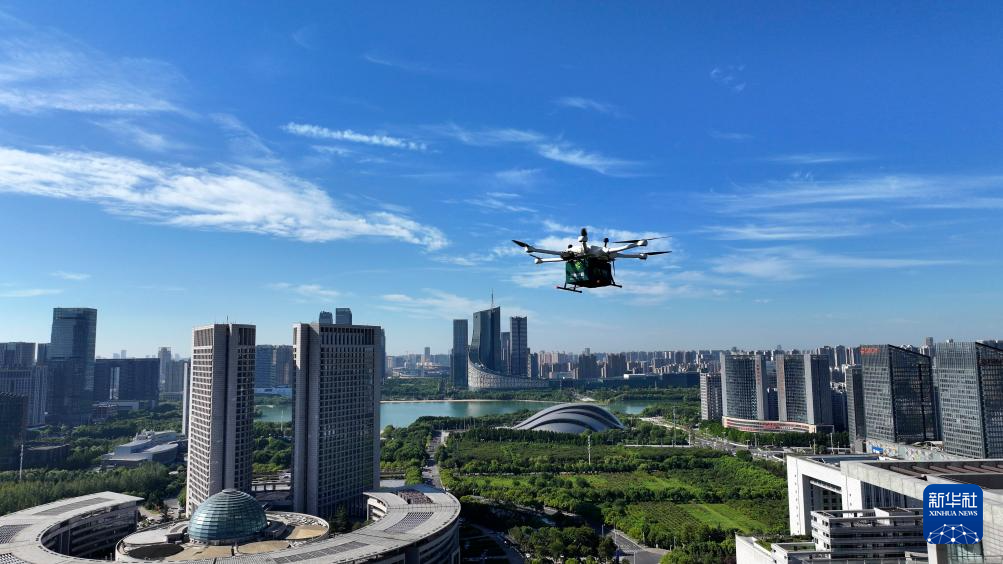 8月20日,在安徽省合肥市蜀山区上空,无人机在配送快递包裹(无人机照片)。
