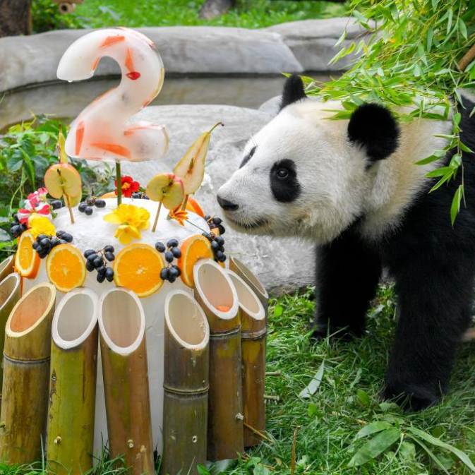 8月24日,大熊猫“喀秋莎”在俄罗斯莫斯科动物园享用“生日蛋糕”。