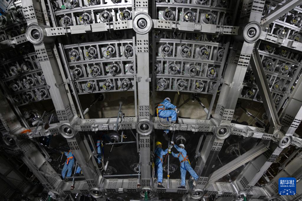工人在江门中微子实验中心探测器不锈钢网架上施工(2024年10月10日摄)。