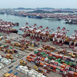 8月26日,货轮在山东港口青岛港前湾港区装卸集装箱(无人机照片)。