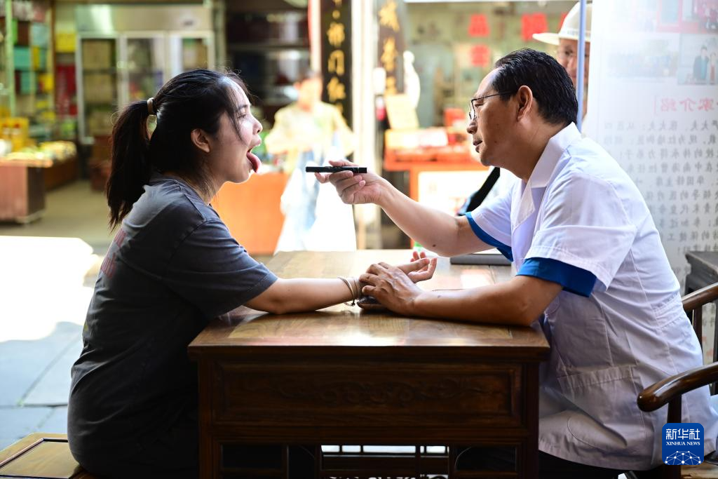 8月28日,在位于黄山市屯溪区的同德仁药店,坐诊医师为游客把脉。