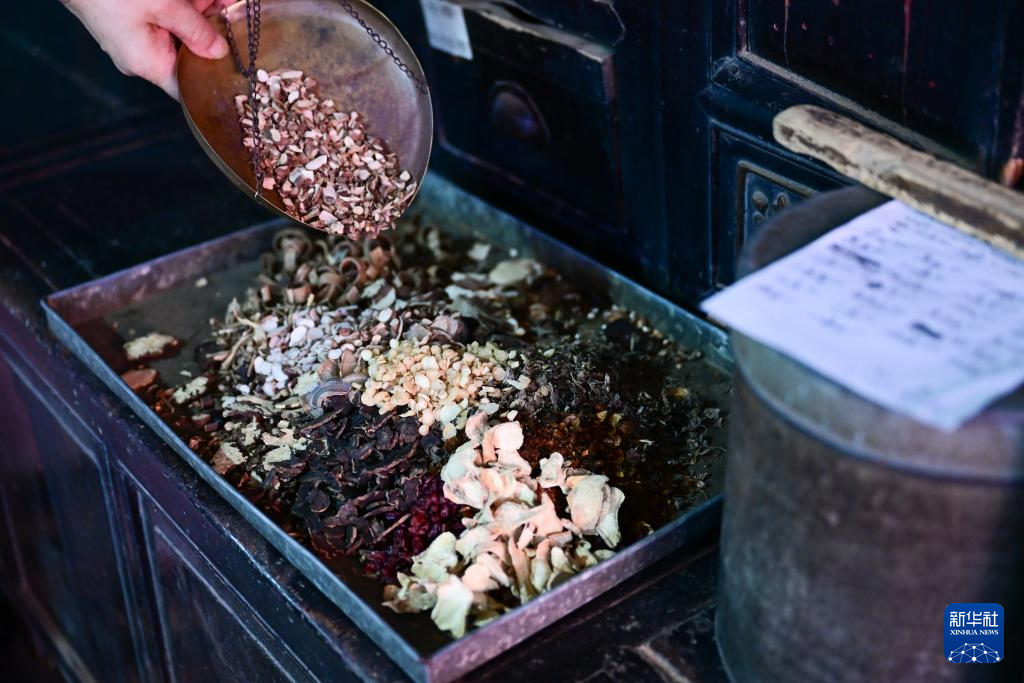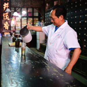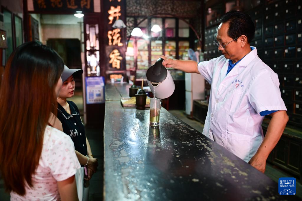 8月28日,在位于黄山市屯溪区的同德仁药店,坐诊医师为游客制作药茶。