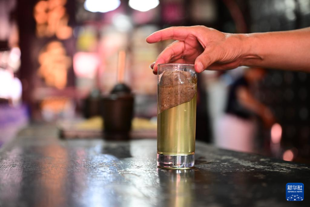 8月28日,工作人员在位于黄山市屯溪区的同德仁药店制作药茶。