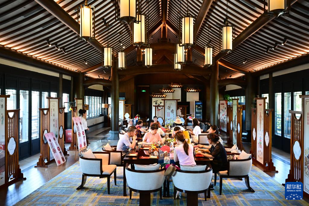 8月28日,游客在位于黄山市徽州区的院藏徽州智慧康养基地里品尝药膳。